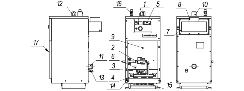 10. Патрубок отопления (подача) 11. Патрубок отопления (обратка) 12. Рым-болт 13. Сливная пробка 14. Место заземления 15. Решетка для регулировки подачи воздуха 16. Предохранительный клапан 17. Дверка . |